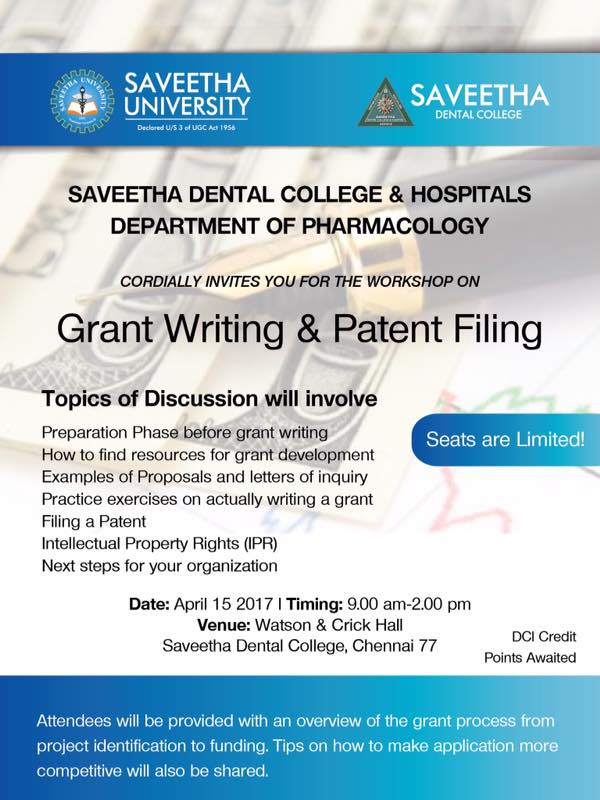 Department of Pharmacology organised one day Workshop on Grant and Patent Filing. Professor. Dr. D. Chamundeeshwari, Principal, Faculty of Pharmacy, Sri Ramachandra University has inaugurated and delivered her keynote address on "Finding & Writing Proposal". There are more than 50 delegates were participated from various colleges.
